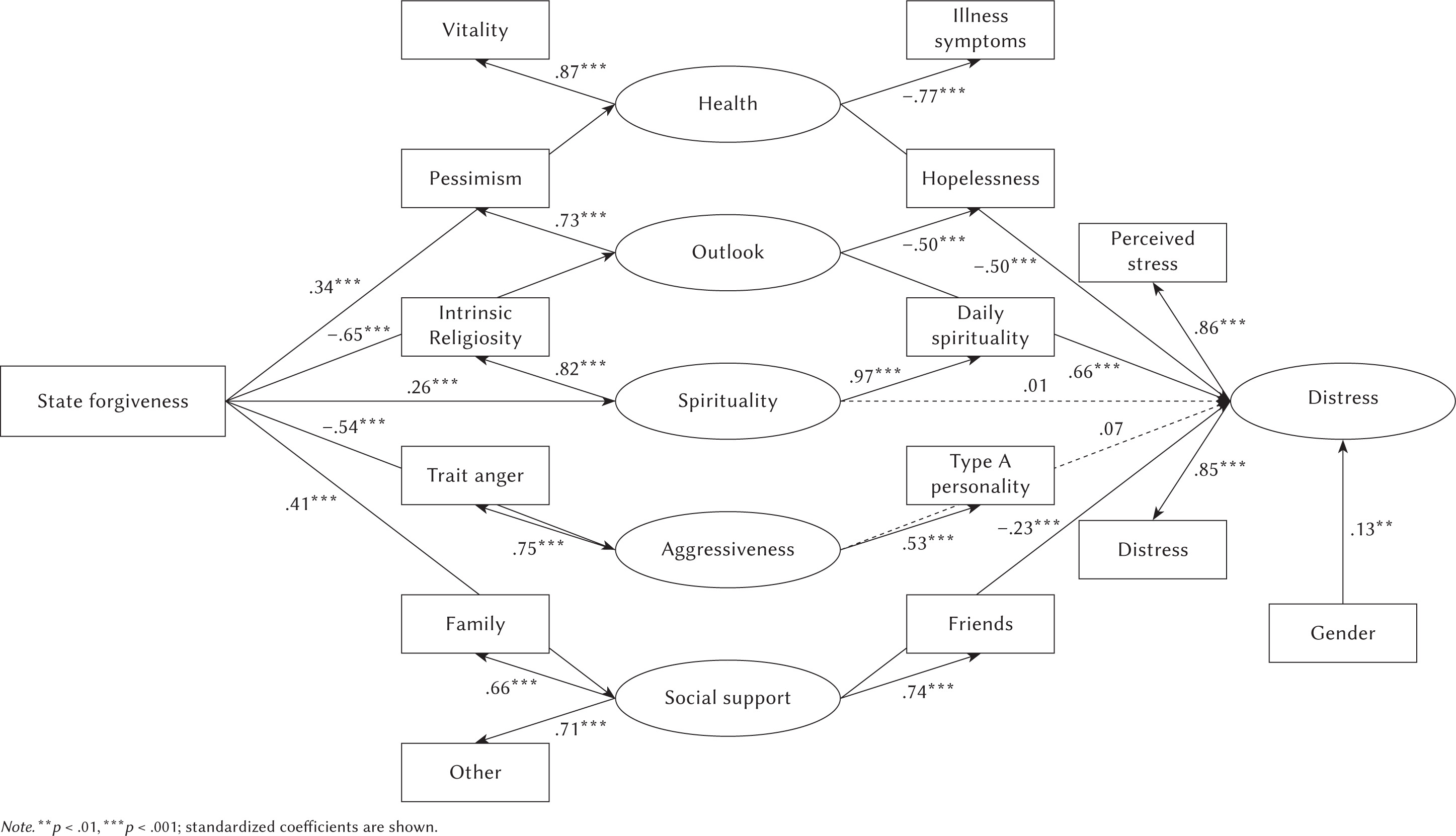Because previous reports have identified many factors that influence perceptions of trauma and distress (e.g., Henselmans et al., 2010; Kagee et al., 2018), and at the same time many studies have identified forgiveness as a critical resilience resource (e.g., Akhtar & Barlow, 2018; Lee & Enright, 2019), in this study we set out to assess the association of forgiveness and distress through five different pathways. On the basis of the previous literature review, we formulated a working hypothesis according to which the negative relationship between forgiveness and distress is multidimensionally mediated by five pathways: (a) health (involving vitality and symptoms of illness), (b) negative outlook on the situation (pessimism and hopelessness), (c) religious-spiritual resources, (d) aggressiveness (anger and type A personality traits), and (e) social support (from friends, family, and significant others). Given that, according to Toussaint et al. (2001), forgiveness may have a greater impact on the health of older adults, in this study we attempted to examine the relationship between this forgiveness and distress among young adults. Our aims were to determine whether forgiveness of others was associated with distress in adolescents and young adults and to identify sociopsychological factors that may enhance the benefits of forgiveness for mental well-being in this age group.