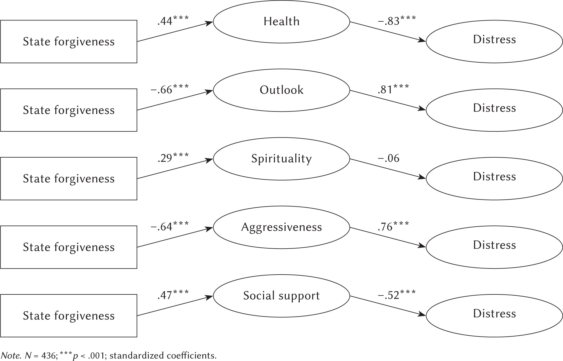 The hypothesised model showed a statistically significant total indirect effect (β = .48, p < .001) through the five latent mediators. Because no test of individual mediators currently exists for multiple-mediator SEMs (in Amos), we tested the individual latent mediators in separate models. Fit indices and indirect effects are given in Table 3. Models and path coefficients are presented in Figure 2. Moreover, the following total effect not included in the model was observed: state forgiveness (β = –.48) was a statistically significant predictor of the latent distress variable (p < .001).
