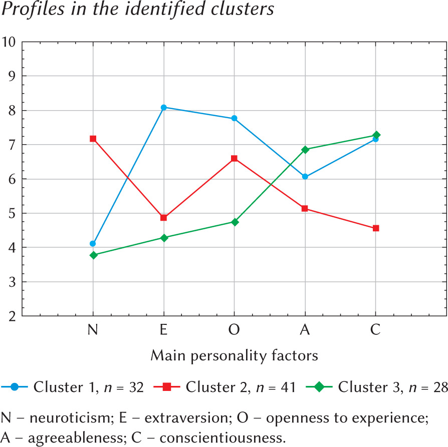 The analysis indicated different personality characteristics in the clusters. In terms of the main personality factors, cluster 1 and cluster 3 are characterised by low intensity of the factor neuroticism (M = 4.09 and 3.79), in contrast to cluster 2 with a high value of this factor (M = 7.17, p < .001).
