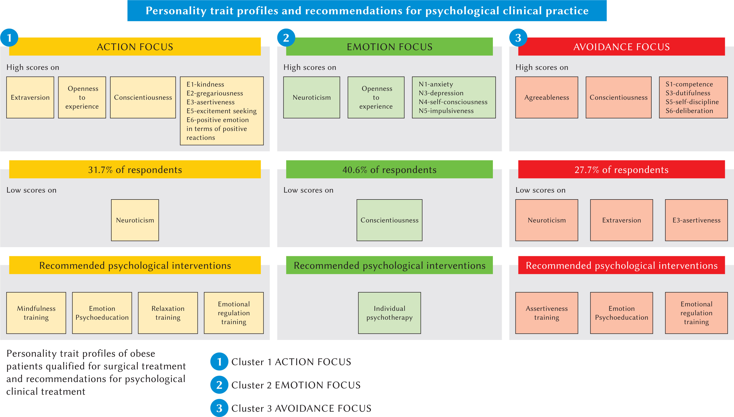 According to meta-analyses, high intensity of the factor neuroticism and lower intensity of the factor conscientiousness differentiate mental disorder syndromes the most, and also indicate the presence of personality disorders (Malouff et al., 2005; Saulsman & Page, 2004). The personality trait profile of the subjects classified in cluster 2 ‘focus on emotions’ meets these criteria and, with regard to the group of bariatric patients, is similar to the results of the profile analysis by Claes et al. (2013), who identified a dysregulated/uncontrolled emotion subtype characterised by increased neuroticism and low conscientiousness in action. In contrast to our study, this subtype was also characterised by low values in the extraversion dimension. Results from a follow-up study with seven years of observations showed that emotional deregulation, understood as greater intensity and frequency of negative emotions, was associated with lower weight loss and more frequent eating disorders after bariatric surgery (Lavender et al., 2020). Similarly, high levels of impulsiveness as a trait were associated with more frequent occurrence of eating disorders and a risk of lower weight loss and/or obesity relapse (Meany et al., 2014; White et al., 2010). Another study of the personality of patients who received bariatric treatment between 5 and 10 years previously showed that lower BMI values were correlated with high values of the factor conscientiousness (Caltabiano, 2022). The above data illustrate the need for psychometric psychological tools to identify those personality traits that may adversely affect the outcome of surgical treatment and the implementation of therapeutic interventions in the pre-operative period (Espada et al., 2021). The aim may be achieved by supplementing the psychological interview with a personality test with the NEO-PI-R Inventory. As a result of conducting a psychological diagnosis in this manner, more objective data are obtained on the basis of which patients can be referred for specialist therapeutic programmes.
