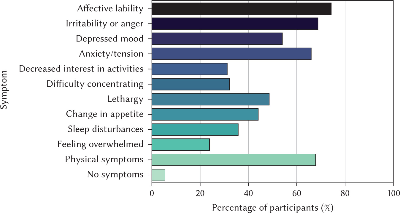 Symptom prevalence based on DSM-5-aligned criteria revealed that affective lability was most frequently reported (n = 81; 74.3%), followed by irritability or anger (n = 75; 68.8%), anxiety or tension (n = 72; 66.1%), physical symptoms (n = 74; 67.9%), depressed mood (n = 59; 54.1%), lethargy (n = 53; 48.6%), appetite changes (n = 48; 44.0%), sleep disturbances (n = 39; 35.8%), and feeling overwhelmed (n = 26; 23.9%), whereas only 6 women (5.5%) reported no symptoms (Figure 1). Notably, 40 participants (36.7%) exhibited symptoms consistent with PMDD, indicating a clinically significant prevalence of self-reported premenstrual mood symptoms in this sample.