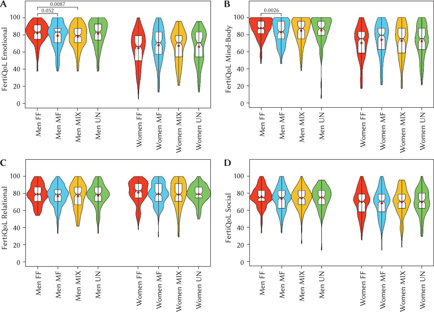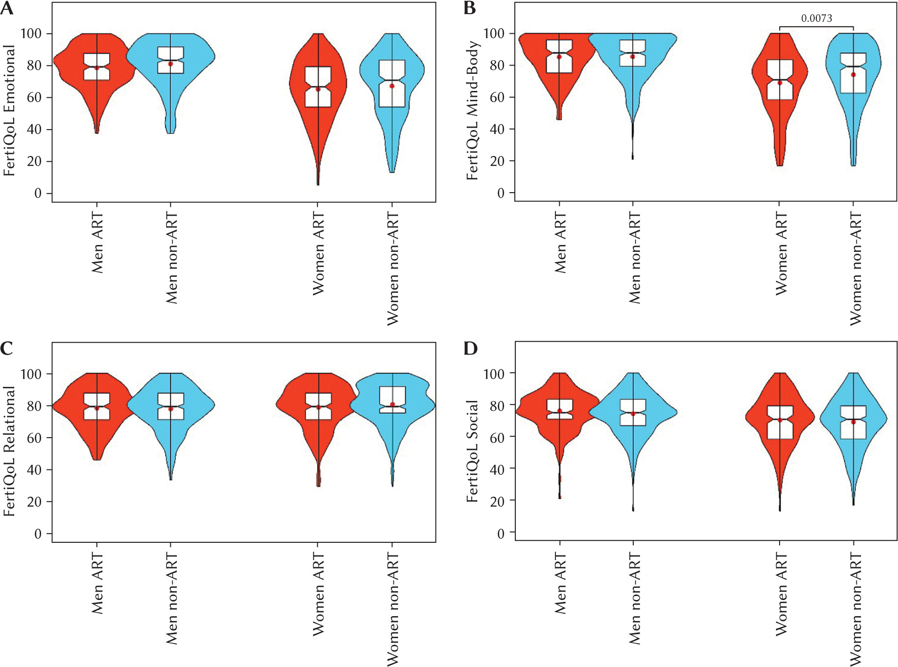 Note. FertiQoL – fertility-related quality of life. Violin and box plots showing men’s and women’s scores on the (a) Emotional, (b) Mind-Body, (c) Relational, and (d) Social subscales of the FertiQoL, categorized by whether they have had prior assisted reproductive technology (ART) experience. A statistically significant difference between women with and without prior ART experience on the Mind-Body subscale is indicated with a p-value.