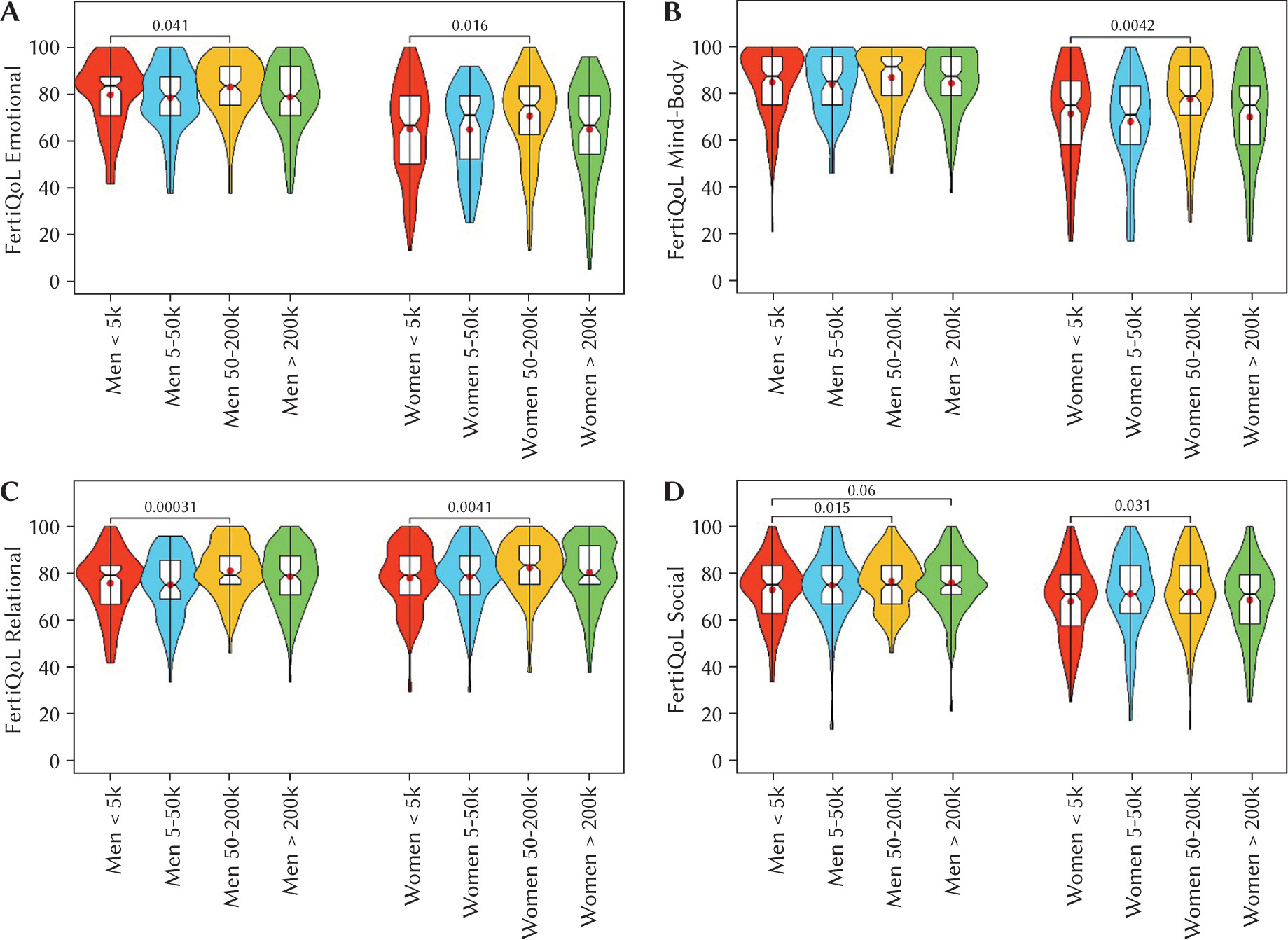 Note. FertiQoL – fertility-related quality of life. Violin and box plots showing men’s and women’s scores on the (a) Emotional, (b) Mind-Body, (c) Relational, and (d) Social subscales of the FertiQoL, categorized by net household income. Statistically significant differences between groups are indicated with p-values.