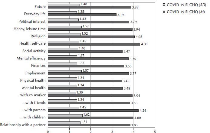 The first step of the analysis was to characterise participants’ perception of the changes in different aspects of their life during the 2-year pandemic time. The standard deviation total result of COVID-19 SLCHQ shows that the respondents included both people who negatively assess changes in life due to the pandemic and people who notice some positive changes (M = 67.26, SD = 15.50). Comparisons of the results of 17 scales (Figure 1) showed significant differences (F = 9.48, p = .001, η2 partial = .06). Post-hoc comparisons showed that the changes caused by the pandemic in taking care of one’s health, relationships with parents and religiosity were assessed more positively (that is, above 4 points on a 7-point scale). In turn, changes in everyday life, mental and physical health, finances and social activity were assessed more negatively (< 4 points). Pandemic-related changes in relationships with partners/spouses, relationships with friends and colleagues, changes in professional work, intellectual abilities, hobbies, interests in politics and perception of the future were rated as average (within 4 points). The differences in health self-care, religiosity and relationships with parents and others were significant at the .001 level.