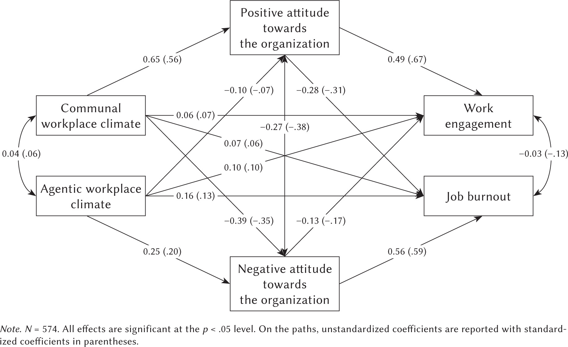 We also propose that the relationship between an agentic workplace climate and work engagement is mediated by a positive attitude toward the organization (hypothesis 7), based on the premise that employees who perceive their organization as competent, efficient, well-organized, and highly successful in achieving goals are more likely to be engaged in their work, as they feel proud and motivated to contribute to organizational goals. Conversely, the link between an agentic workplace climate and job burnout is hypothesized to be mediated by negative attitudes toward the organization (hypothesis 8). In this case, the dark side of an agentic workplace climate is considered, which may be associated with pressure to achieve results and enforcing discrepancies between plans and outcomes, undoubtedly leading to negative experiences for employees. In this context, an agentic workplace climate may lead to a negative attitude towards the organization, and further, to burnout.